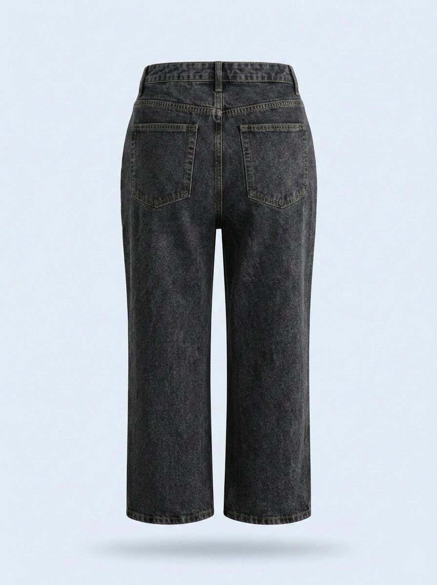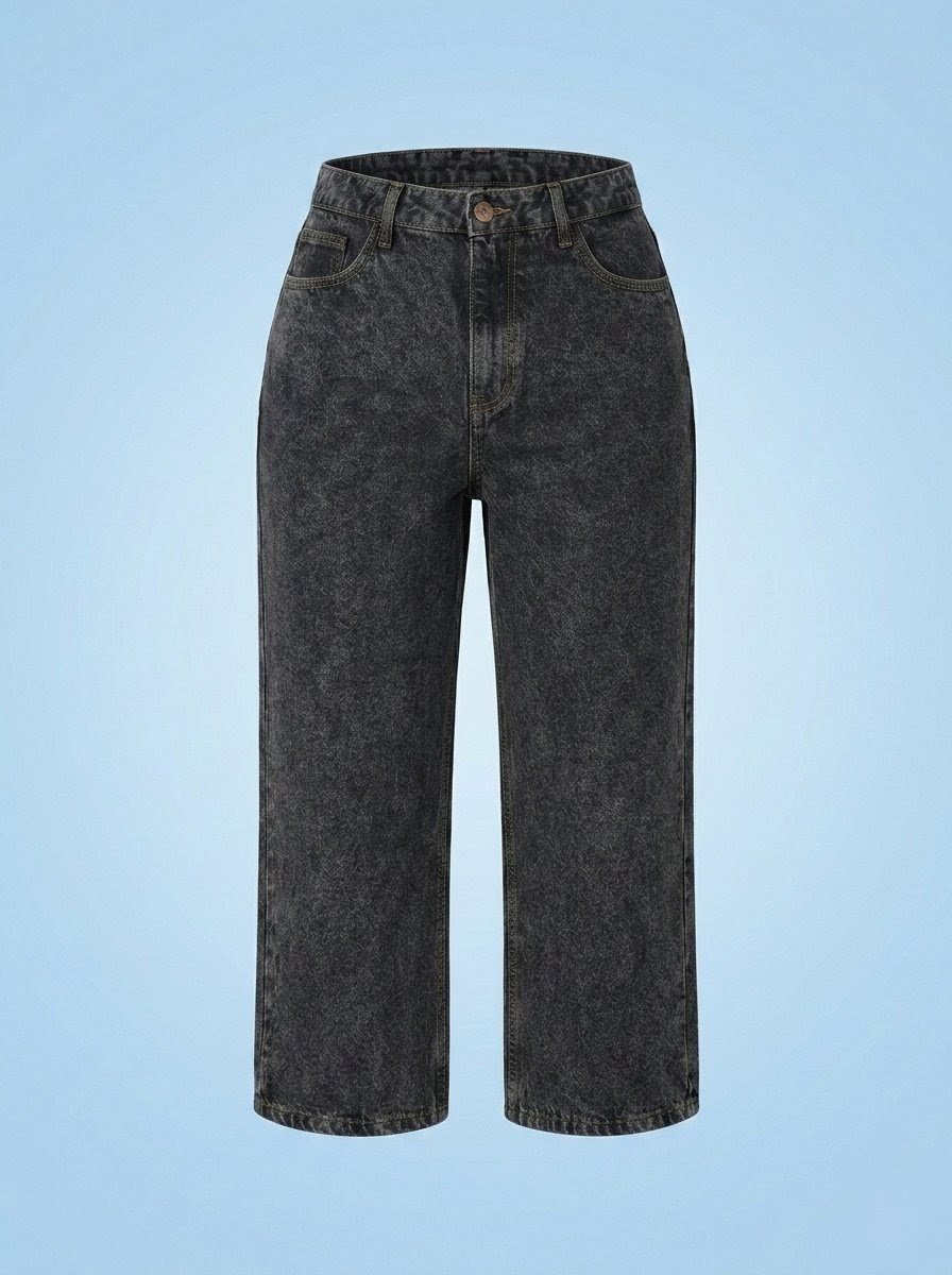 The standout feature is the heavily textured acid-wash finish, giving the charcoal-to-black fabric a weathered, marble-like appearance. Design details include classic five-pocket styling, reinforced belt loops, and a single-button fly closure with a brass-toned shank. The hem is finished with a clean, double-stitched edge, making them perfect for pairing with chunky sneakers or platform boots for a bold, urban look.